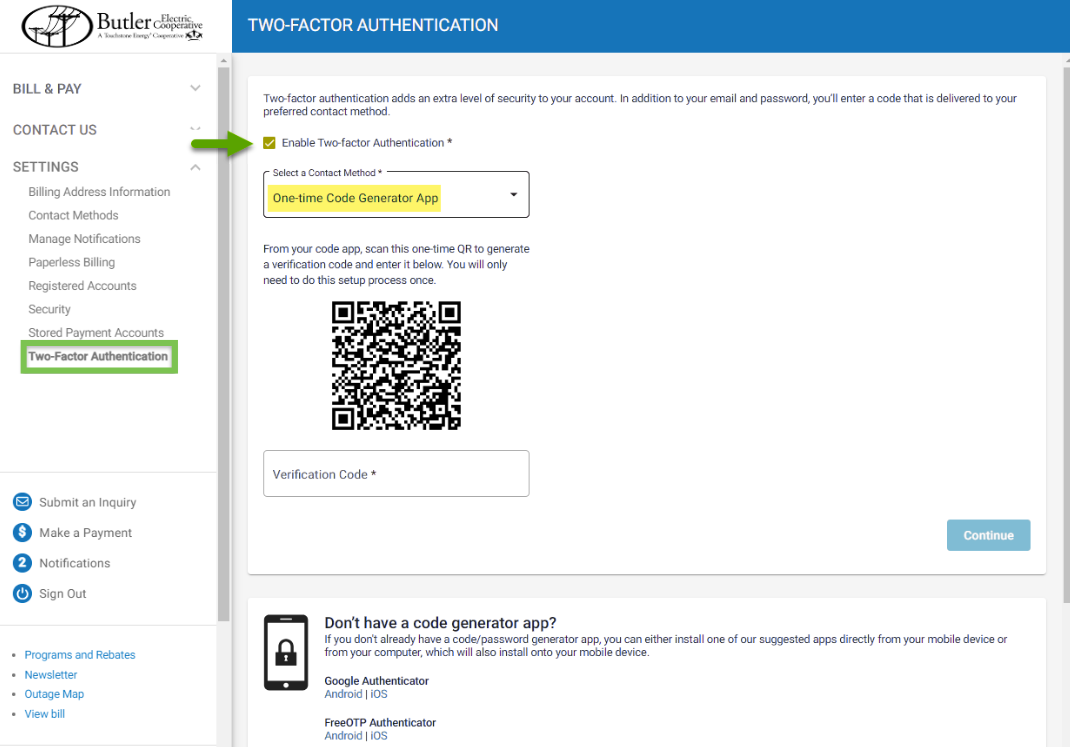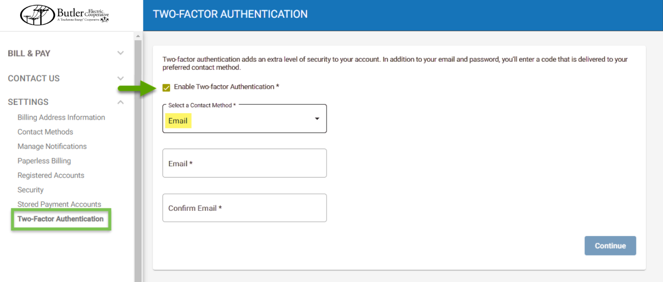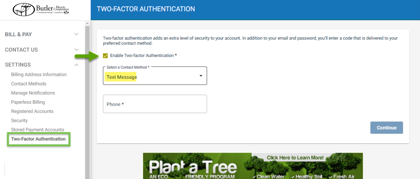 Login to your SmartHub account and navigate to Settings > Two-Factor Authentication. Check the Enable Two-factor Authentication. Select your contact method. Choose between: