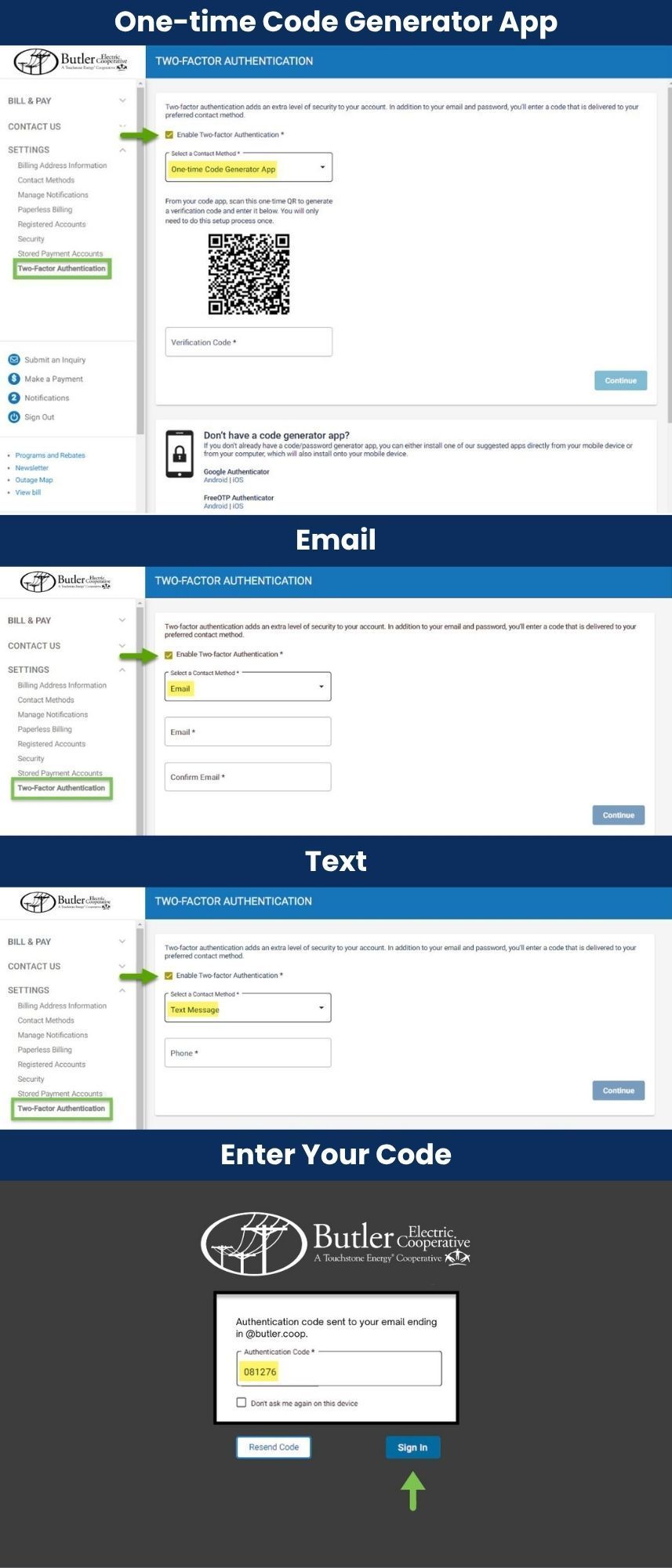 Two-Factor Authentication (also know as 2FA, Multi Factor Authentication or MFA) adds an extra layer of verification on top of a user’s password when accessing their SmartHub account. Instead of providing only a password to log in to Smart-Hub, 2FA requires users to provide an additional code or confirmation from a text, email, or verification app.